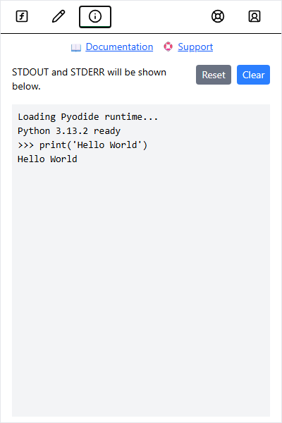 The Info tab (ℹ️) displays print() output and error tracebacks (STDOUT and STDERR).