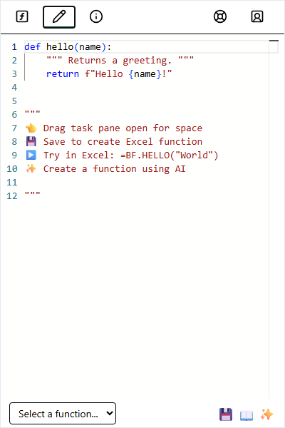 You can type functions directly into cells (for example, =HELLO("World")) or use the Function Dialog for a guided experience.