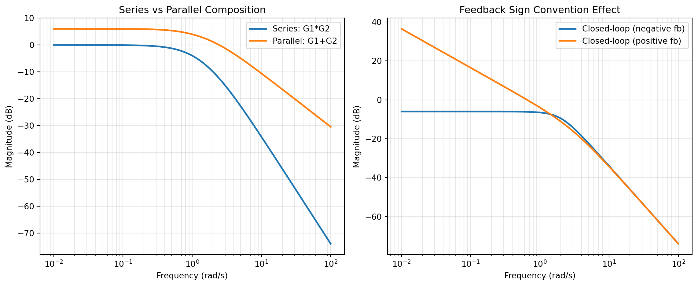Figure 1: Interconnection concepts: (left) series vs parallel composition of two first-order subsystems, and (right) closed-loop magnitude trend under negative vs positive feedback sign convention.