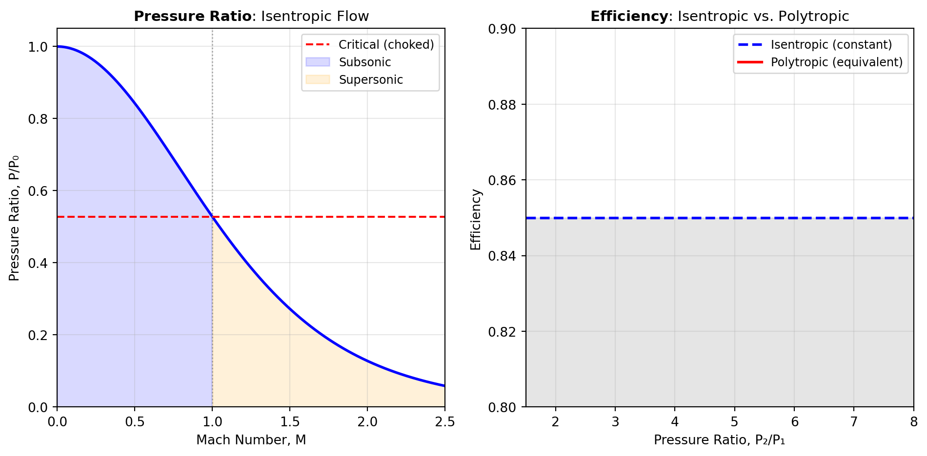 Figure 1 illustrates the relationship between pressure ratio and Mach number in isentropic flow, and the efficiency conversions between isentropic and polytropic processes in compression.