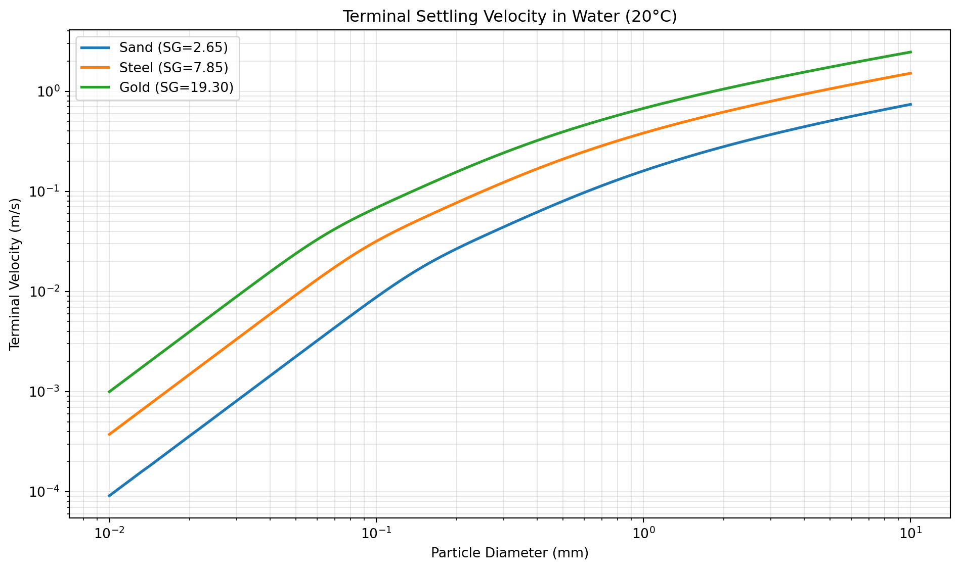 Figure 1: Terminal velocity of particles in water: Settling velocity vs. diameter for particles of different specific gravities (SG). Sand (SG=2.65), Steel (SG=7.85), Gold (SG=19.3).