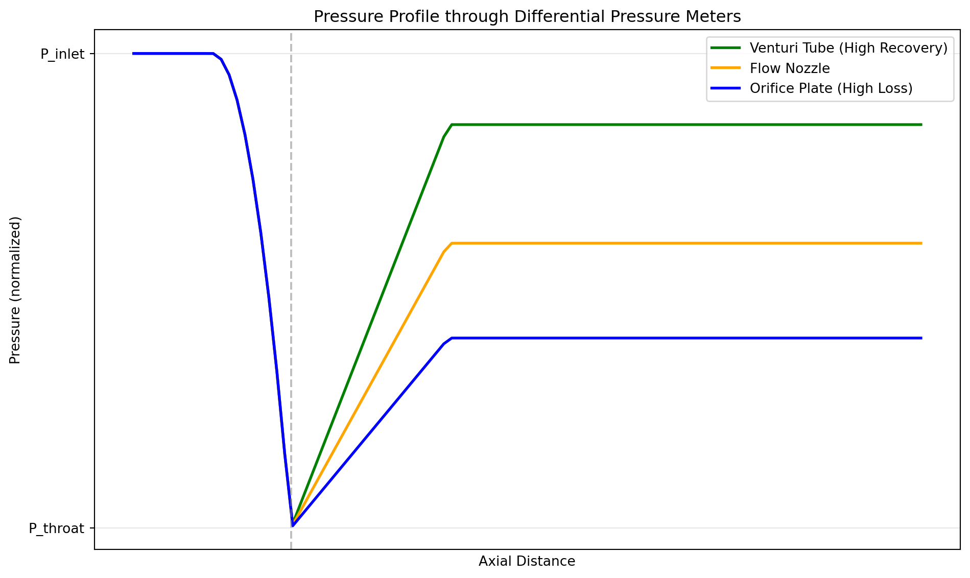Figure 1: Pressure Separation and Recovery: Conceptual pressure profiles through varying meter types. The Venture tube (Green) recovers most of the pressure drop, while the Orifice plate (Blue) results in significant permanent energy loss.