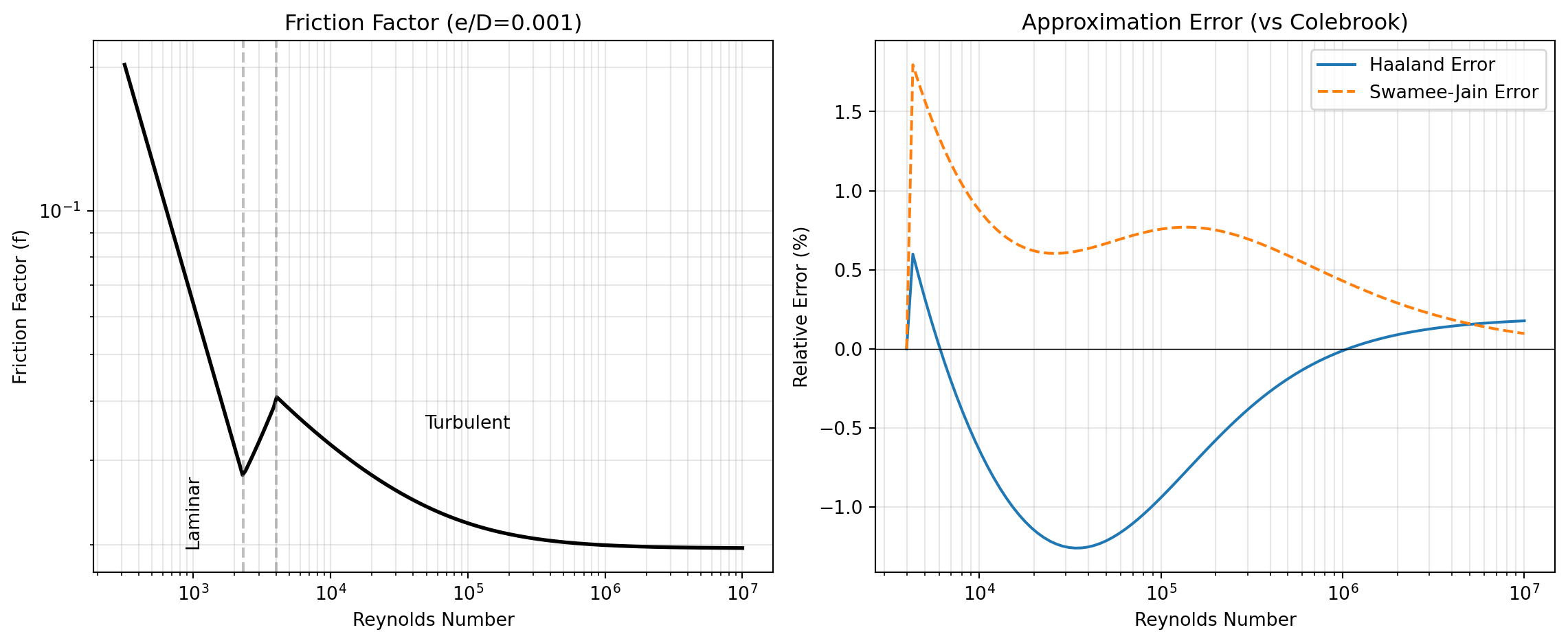 Explicit Approximations: Explicit approximations avoid iteration by providing direct formulas that approximate the Colebrook equation with varying accuracy: - SWAMEE_JAIN: Popular explicit approximation with ±1% accuracy over a wide range of practical conditions. - HAALAND: Simpler explicit formula with good accuracy for most engineering applications. - MOODY: Historical correlation developed alongside the famous Moody diagram. - CHURCHILL: Universal correlation valid for all flow regimes (laminar, transition, and turbulent).