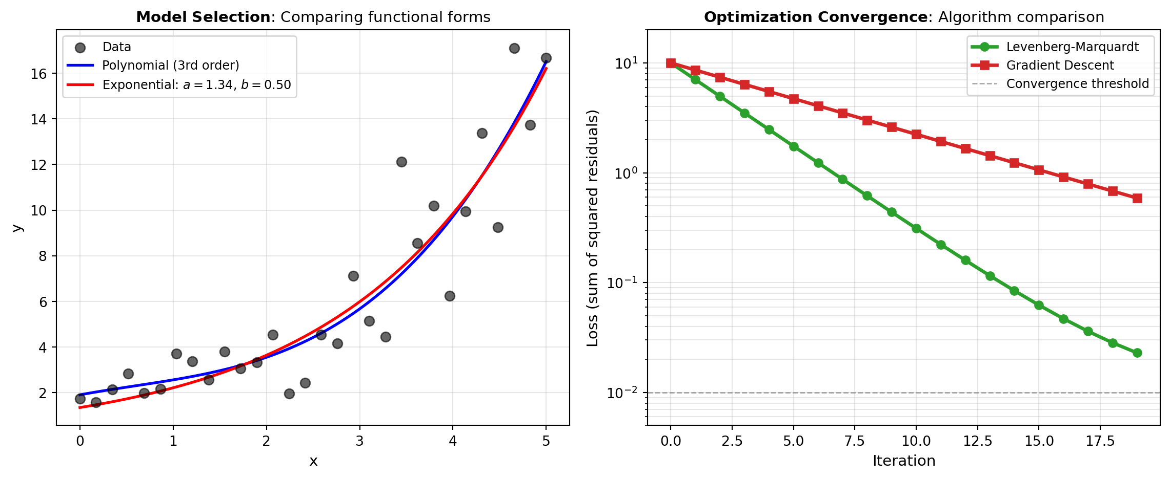 The visualization below illustrates two fundamental curve fitting scenarios: least squares fitting of synthetic data to both polynomial and exponential models, and the comparison of different optimization algorithms converging to the optimal parameter values.