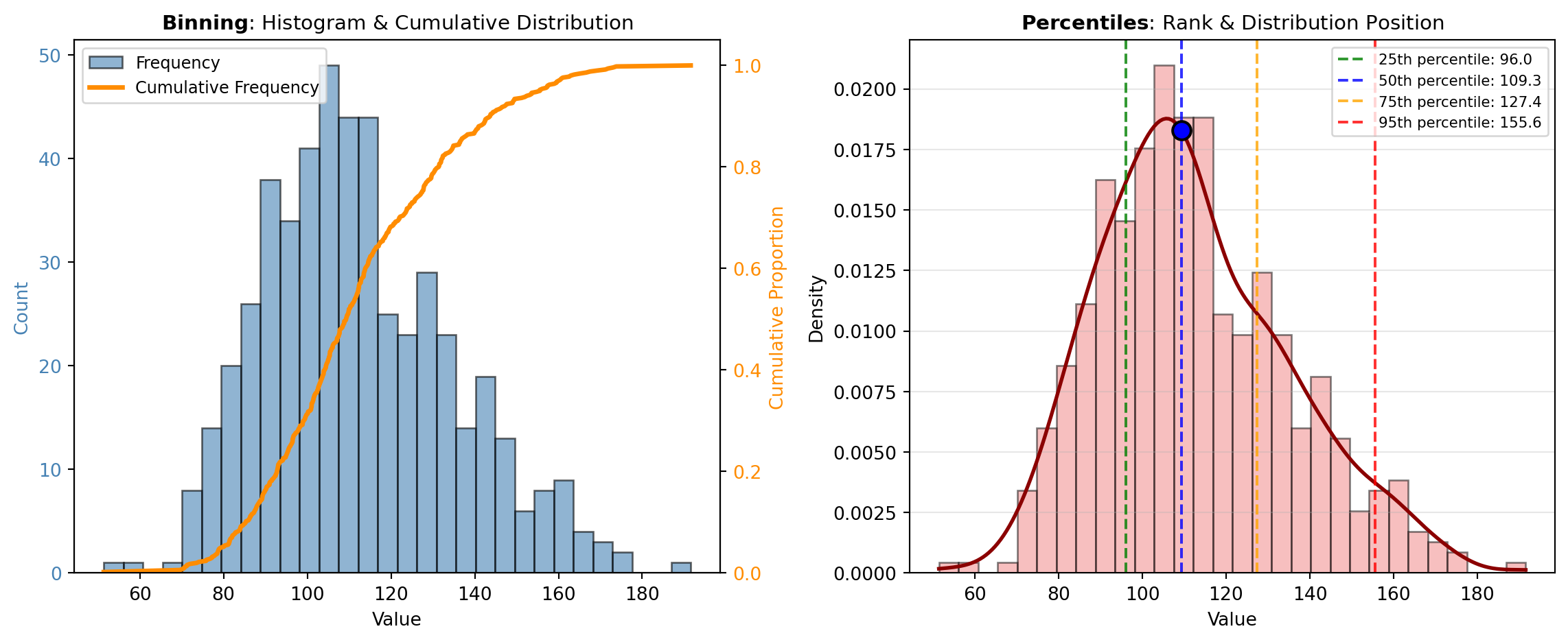 The visualization below illustrates how these concepts interconnect: one pane shows the relationship between binning, relative frequency, and cumulative distribution; the other demonstrates percentile interpretation in the context of an actual distribution.