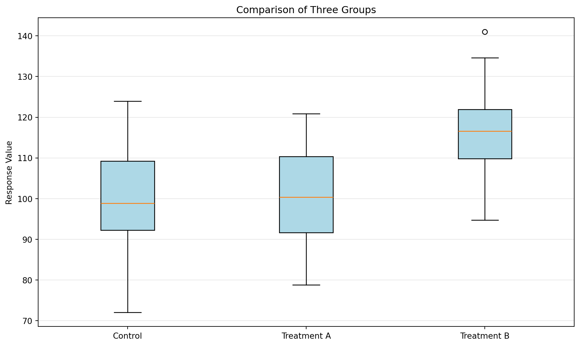 Figure 1: Compare Groups: Boxplots showing three groups with different means. ANOVA (F_ONEWAY) would detect that these groups are significantly different (p < 0.001), prompting post-hoc testing to find pairwise differences.