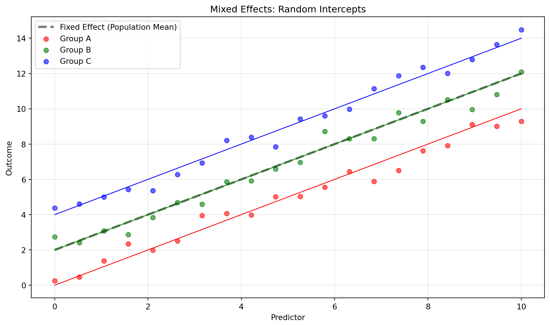 Figure 1: Fixed vs Random Effects: Fixed effects (dashed line) estimate the global trend. Random intercepts allow each group (colors) to have its own baseline, capturing the clustered nature of the data.