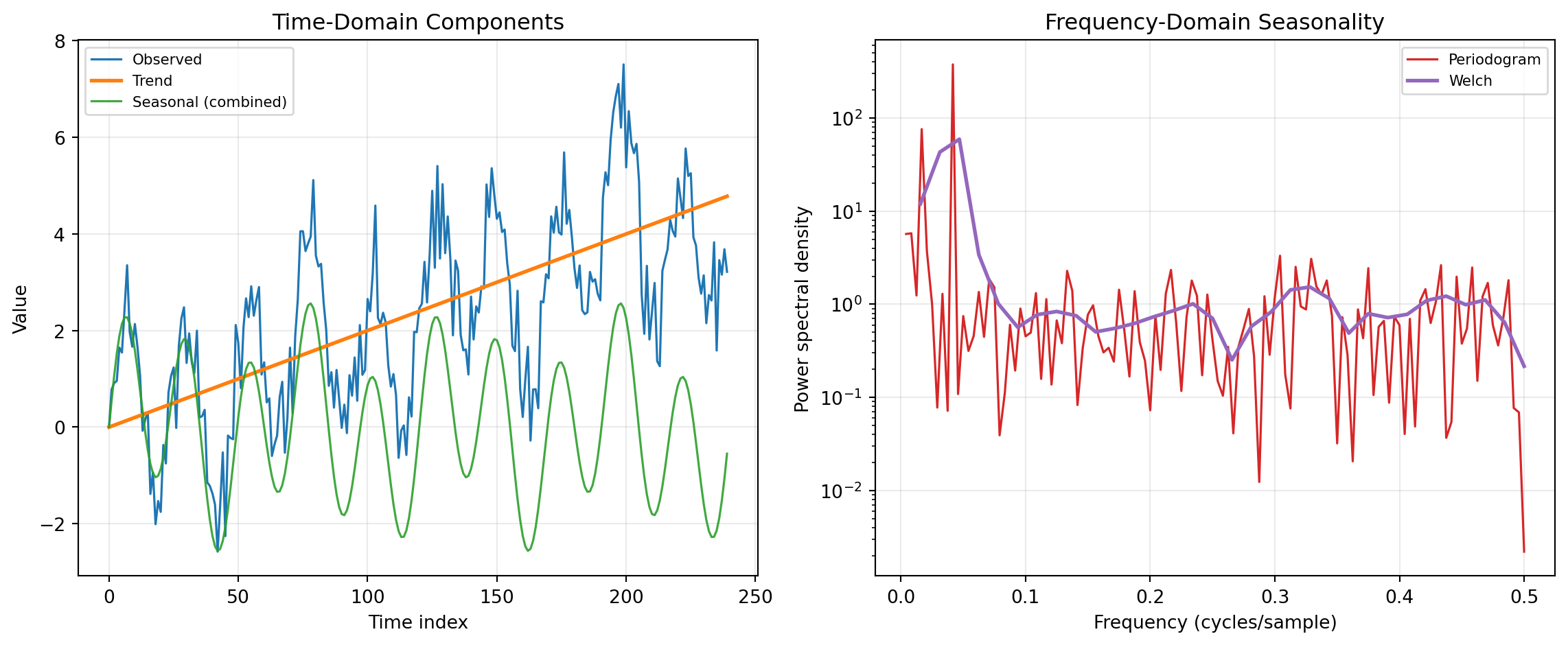 Time-series decomposition separates observed data into interpretable components such as trend, seasonality, and residual variation. In practice, decomposition and seasonality analysis helps analysts distinguish structural change from recurring calendar effects before modeling or forecasting. This distinction matters in operations, finance, and engineering because decisions depend on whether movement is persistent, seasonal, or noise-driven. The same category also connects naturally to frequency-domain methods that reveal periodic structure from power spectra.